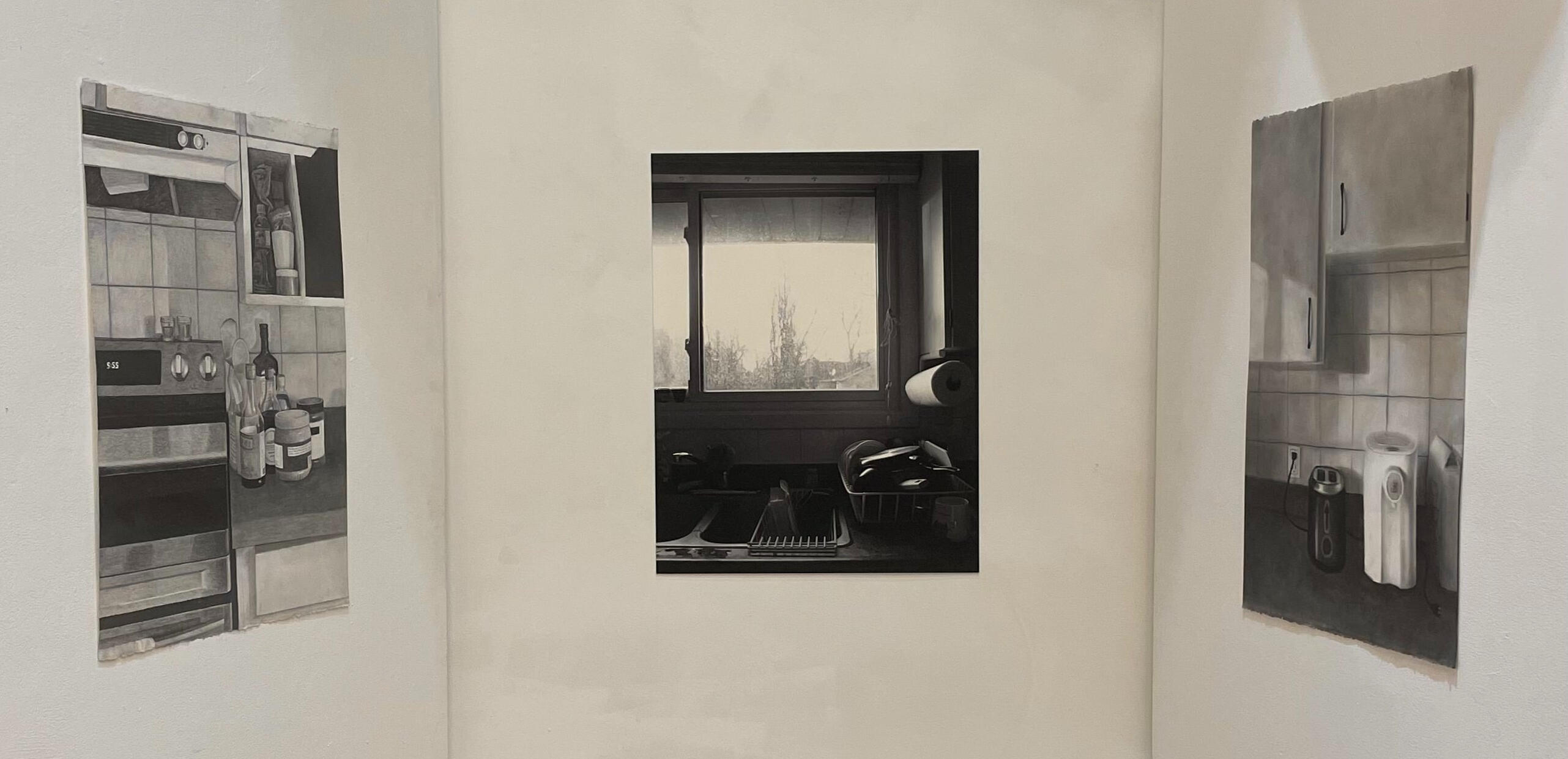 In this self-directed project, I explored the concept of memory through photography and drawing, focusing on three key aspects: Documentation, Recollection, and Erosion. To represent these themes, I created a triptych centered around a space rich with personal memories, my kitchen. Choosing this familiar yet universal setting allows the work to remain open-ended, inviting viewers to connect with their own experiences. The central piece of the triptych is a photograph printed on cold press paper, depicting my kitchen window and sink area. This image represents the documentation of memory, as a photograph serves as a precise snapshot of a moment in time. To the left, a graphite drawing on Stonehenge paper portrays my oven area, symbolizing recollection. Graphite, with its precision and ability to capture fine details, allows me to recreate the scene with depth. The presence of numerous bottles and jars on the counter adds complexity to the composition. However, just as a drawing can never be an exact replica of a photograph, our recollection of a memory is never a perfect reproduction of the actual experience. On the right, a charcoal drawing on Stonehenge paper depicts a counter area, representing the erosion of memory. The soft, smudged marks of charcoal mirror the way memories fade and blur over time, simplifying and distorting details.